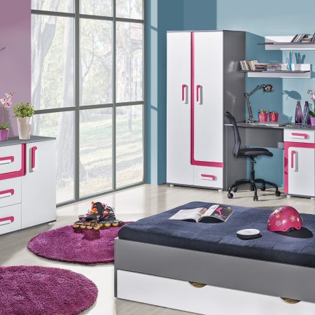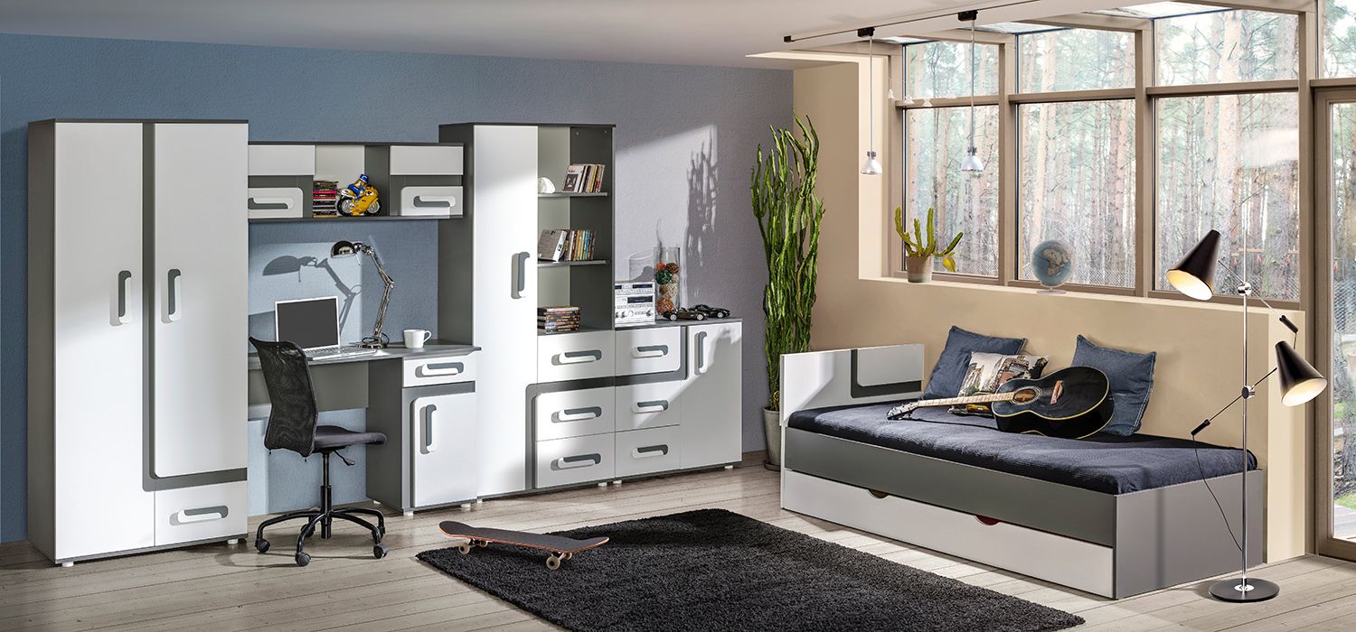 Kolekcja mebli Santo to dynamiczne i nowoczesne rozwiązanie, idealne do pokoju młodzieżowego. Meble w kolorze antracytu z białymi frontami wyróżniają się stylowymi dodatkami i uchwytami, dostępnymi w kolorze antracytu, różu lub turkusu.