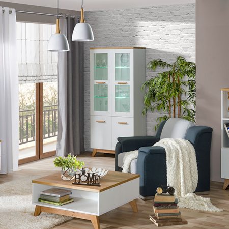 System meblowy Zink to esencja skandynawskiego designu, łącząca minimalistyczną estetykę z praktycznymi rozwiązaniami. Meble wyróżniają się prostymi frontami w odcieniu sosny andersen oraz akcentami imitującymi drewno, które doskonale wpisują się w nowoczesne trendy wnętrzarskie. Drewniane nóżki i uchwyty, wykonane z naturalnego dębu i dopasowane kolorystycznie do blatów, dodają każdemu elementowi kolekcji wyjątkowego charakteru. Modułowy system Zink oferuje elastyczność w aranżacji różnych przestrzeni – od sypialni i pokojów młodzieżowych po salony i biura.